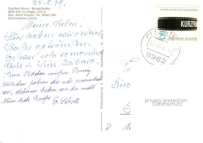 73070408 alte Postkarte Zell Allgaeu Gasthof Baeren Burgschenke postalisch gelaufen Erhaltung siehe scans [WerneD78] KatCode: 11110009777125