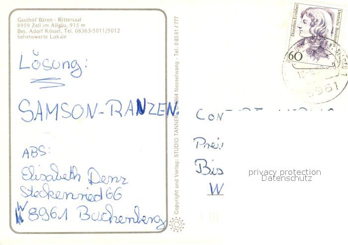 73103512 alte Postkarte Zell Allgaeu Gasthof Baeren Rittersaal postalisch gelaufen Erhaltung siehe scans [KathaD81] KatCode: 11110009777125