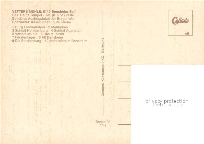 73259275 Zell Bensheim Vetters Muehle Burg Frankenstein Schloss Heiligenberg Marktplatz postalisch nicht gelaufen Erhaltung siehe scans [NatalD47] KatCode: 11110006431002