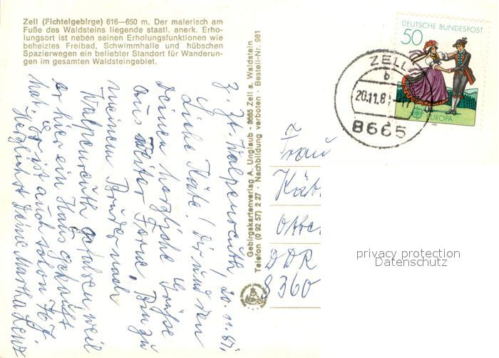 73671808 alte Postkarte Zell Fichtelgebirge Panorama Altenheim Waldsteinstrasse Forstbrunnen Hauptschule Freibad postalisch gelaufen Erhaltung siehe scans [WerneD78] KatCode: 11110009475189