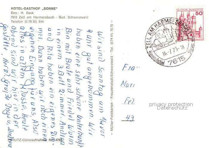 73332174 alte Postkarte Zell Harmersbach Hotel Gasthaus Sonne postalisch gelaufen Erhaltung siehe scans [LiesaD40] KatCode: 11110008317146