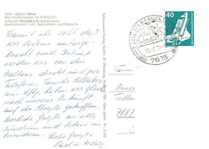 73898369 alte Postkarte Zell Harmersbach Hotel Gasthof Restaurant Baeren postalisch gelaufen Erhaltung siehe scans [WerneD78] KatCode: 11110008317146
