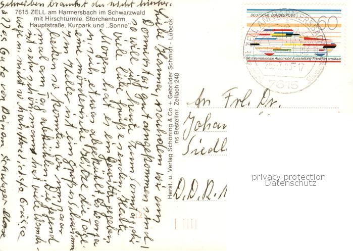 73597270 alte Postkarte Zell Harmersbach Panorama mit Hirschtuermle Storchenturm Hauptstrasse Kurpark und Sonne postalisch gelaufen Erhaltung siehe scans [WerneD78] KatCode: 11110008317146
