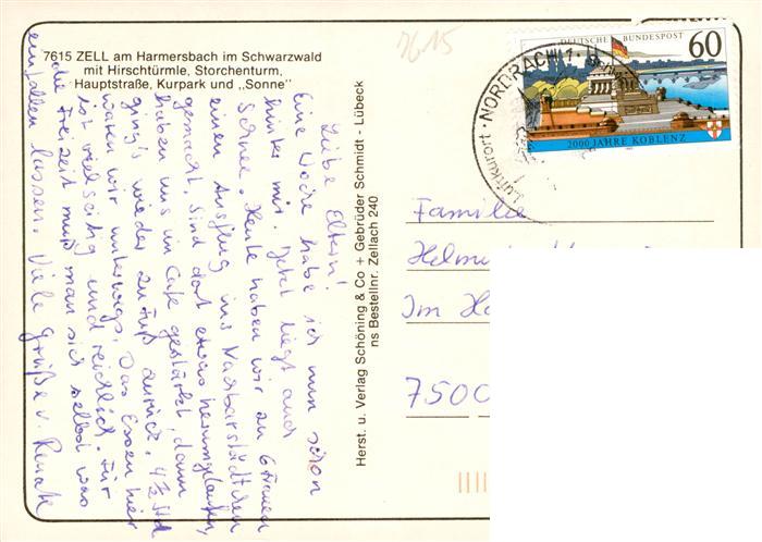 73931330 alte Postkarte Zell Harmersbach Panorama mit Hirschturm Storchenturm Kurklinik Ortenau Pfarrhofgraben und Park postalisch gelaufen Erhaltung siehe scans [FriedD77] KatCode: 11110008317146