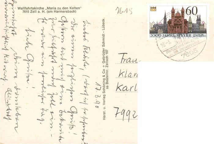 73928559 alte Postkarte Zell Harmersbach Wallfahrtskirche Maria zu den Ketten postalisch gelaufen Erhaltung siehe scans [FriedD77] KatCode: 11110008317146