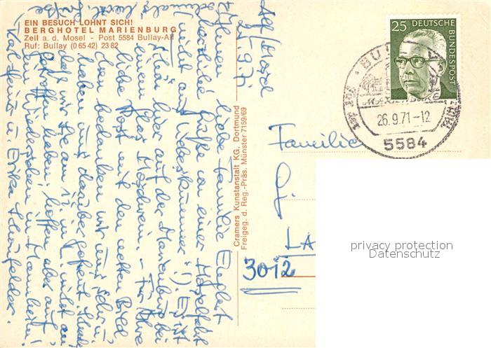 73101592 alte Postkarte Zell Mosel Berghotel Marienburg Fliegeraufnahme postalisch gelaufen Erhaltung siehe scans [WerneD78] KatCode: 11110007135092
