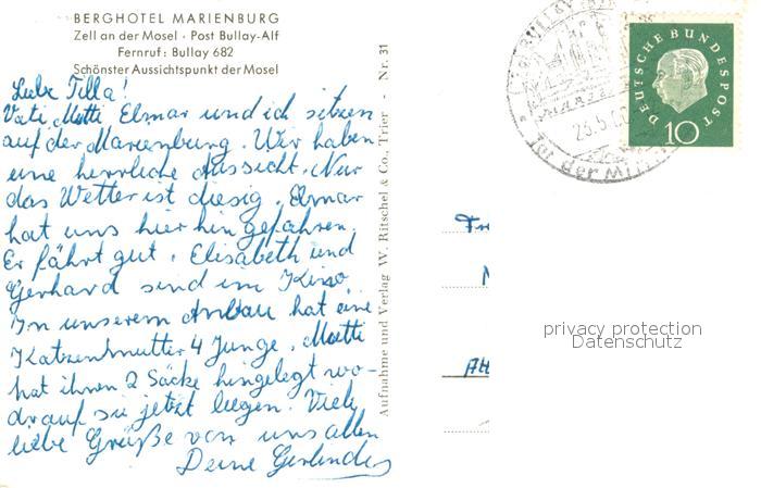 73747499 alte Postkarte Zell Mosel Berghotel Marienburg Panorama postalisch gelaufen Erhaltung siehe scans [WerneD78] KatCode: 11110007135092