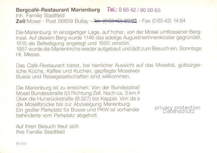73232350 Zell Mosel Fliegeraufnahme Bergcafe Marienburg postalisch nicht gelaufen Keine Postkarte (siehe scan) Erhaltung siehe scans [NatalD47] KatCode: 11110007135092