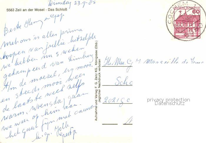 72743294 alte Postkarte Zell Mosel Schloss postalisch gelaufen Erhaltung siehe scans [FriedD77] KatCode: 11110007135092