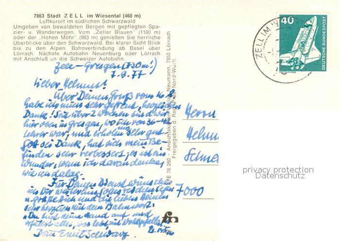 73662133 alte Postkarte Zell Wiesental Fliegeraufnahme postalisch gelaufen Erhaltung siehe scans [LiesaD40] KatCode: 11110008336103