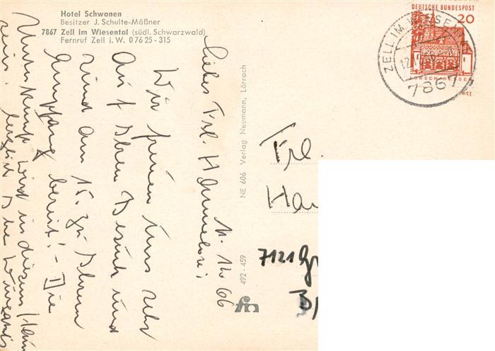 73880611 alte Postkarte Zell Wiesental Hotel Schwanen postalisch gelaufen Erhaltung siehe scans [WerneD78] KatCode: 11110008336103