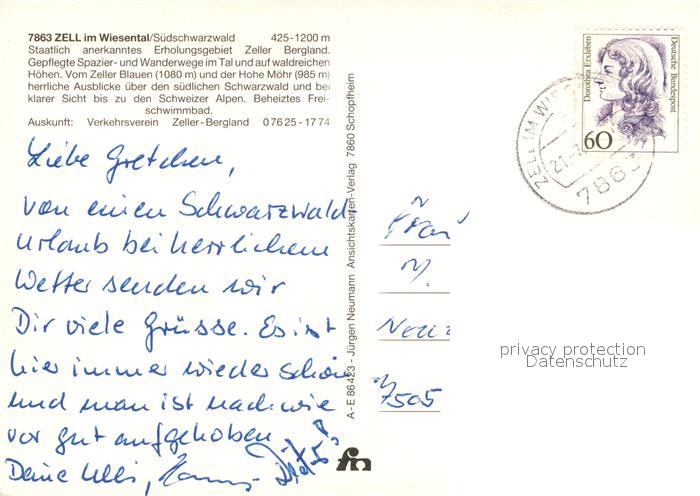 73265806 alte Postkarte Zell Wiesental Ortsansicht mit Kirche Hauptstrasse Schwanenteich Brunnen Erholungsgebiet Zeller Bergland Schwarzwald postalisch gelaufen Erhaltung siehe scans [FriedD77] KatCode: 11110008336103