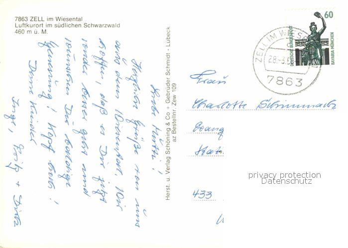 72698384 alte Postkarte Zell Wiesental Panorama Kirche Rathaus Schwimmbad Stadthalle Stadtpark postalisch gelaufen Erhaltung siehe scans [WerneD78] KatCode: 11110008336103