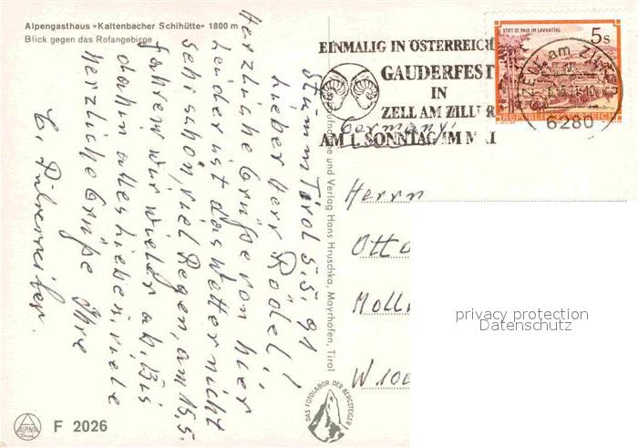 72913804 alte Postkarte Zell Ziller Tirol Alpengasthaus Kaltenbacher Schihuett Rofangebirge postalisch gelaufen Erhaltung siehe scans [KathaD81] KatCode: 11390335070940