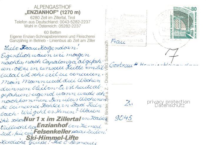 13212927 alte Postkarte Zell Ziller Tirol Alpengasthof Enzianhof postalisch gelaufen Erhaltung siehe scans [LiesaD40] KatCode: 11390335070940