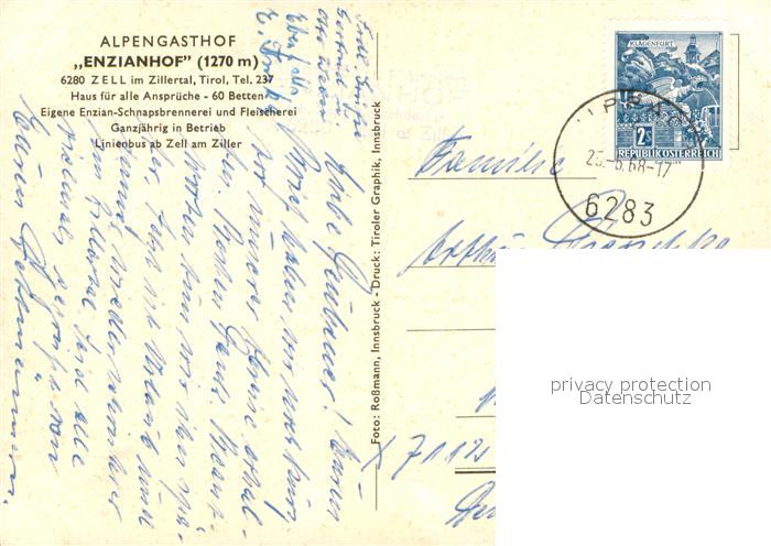 73643577 alte Postkarte Zell Ziller Tirol Alpengasthof Enzianhof Terrasse postalisch gelaufen Erhaltung siehe scans [WerneD78] KatCode: 11390335070940