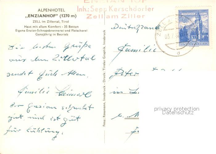 73629993 alte Postkarte Zell Ziller Tirol Alpenhotel Enzianhof postalisch gelaufen Erhaltung siehe scans [WerneD78] KatCode: 11390335070940