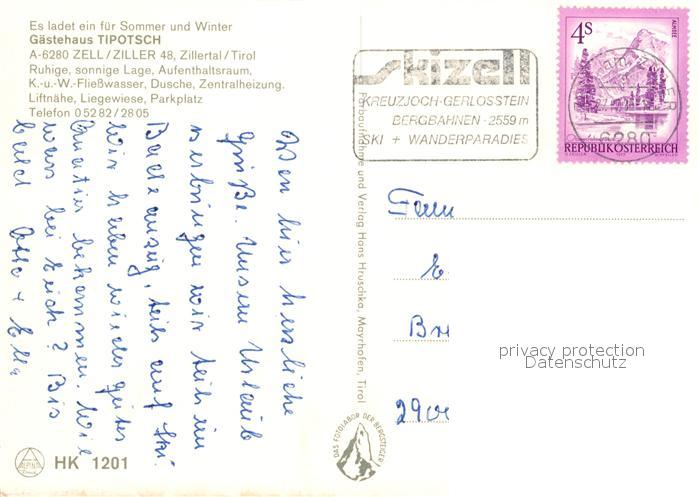 13223013 alte Postkarte Zell Ziller Tirol Gaestehaus Tipotsch postalisch gelaufen Erhaltung siehe scans [LiesaD40] KatCode: 11390335070940