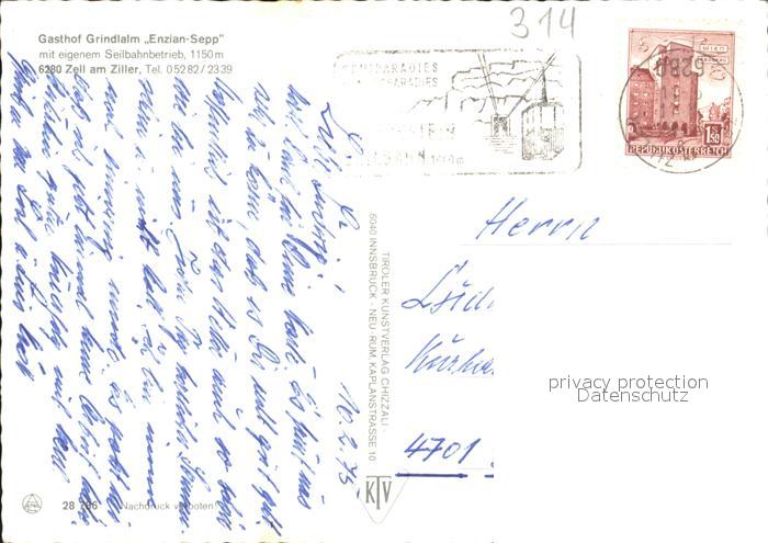 72128308 alte Postkarte Zell Ziller Tirol Gasthof Grindlalm Enzian Sepp mit Seilbahnbetrieb postalisch gelaufen Erhaltung siehe scans KatCode: 11390335070940