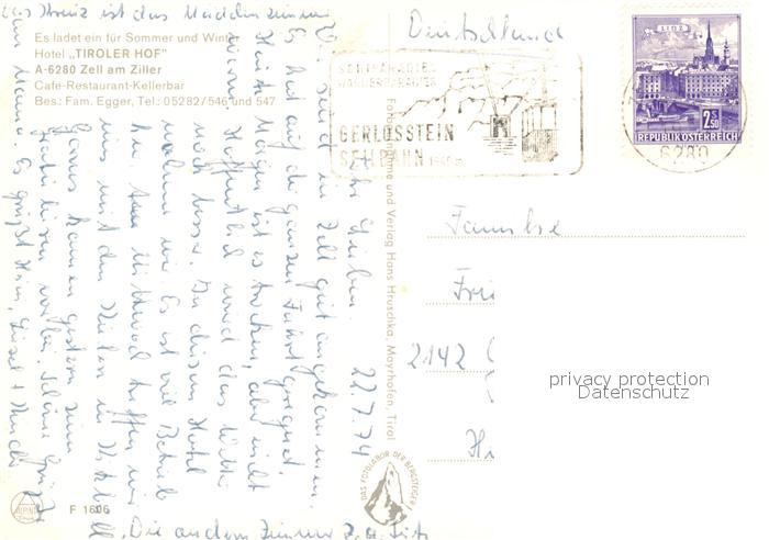 73491837 alte Postkarte Zell Ziller Tirol Hotel Tiroler Hof postalisch gelaufen Erhaltung siehe scans [WerneD78] KatCode: 11390335070940