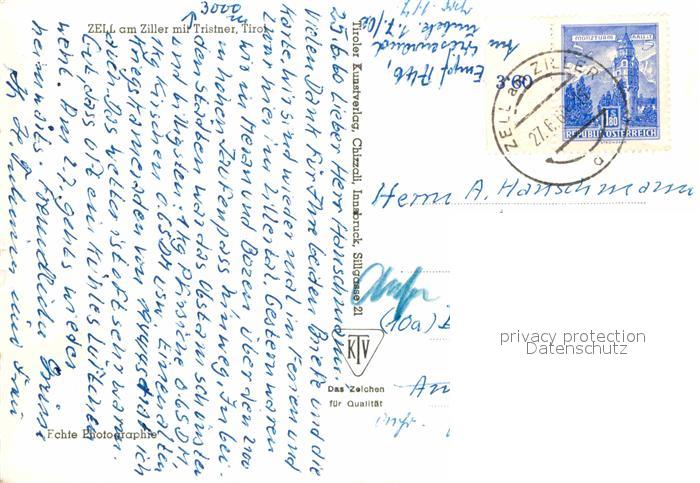 72639503 alte Postkarte Zell Ziller Tirol Tristner postalisch gelaufen Erhaltung siehe scans [KathaD79] KatCode: 11390335070940