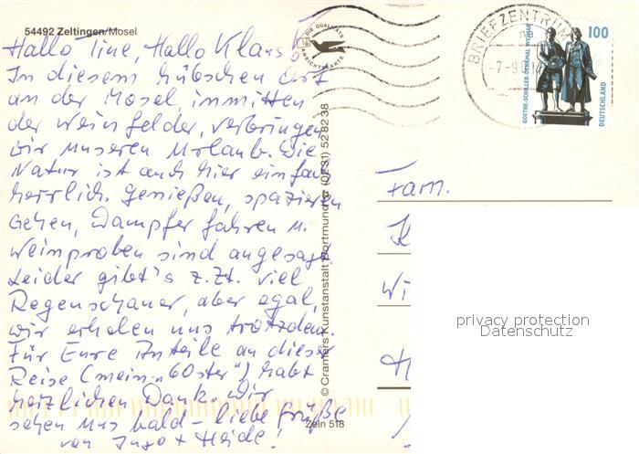 73671423 alte Postkarte Zeltingen Mosel Panorama Blick ins Moseltal Fahrgastschiff Ortszentrum Fachwerkhaeuser Poesie postalisch gelaufen Erhaltung siehe scans [FriedD77] KatCode: 11110007231136