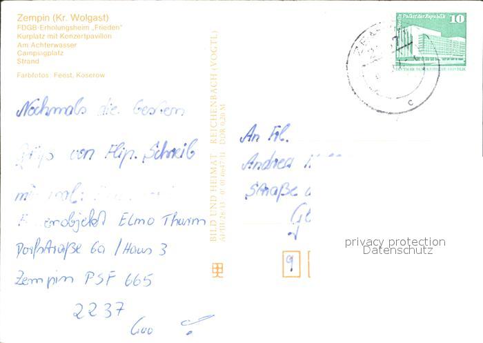 72337048 alte Postkarte Zempin FDGB Erholungsheim Frieden Kurplatz Konzertpavillon Achterwasser Campingplatz Strand postalisch gelaufen Erhaltung siehe scans KatCode: 11110013059105