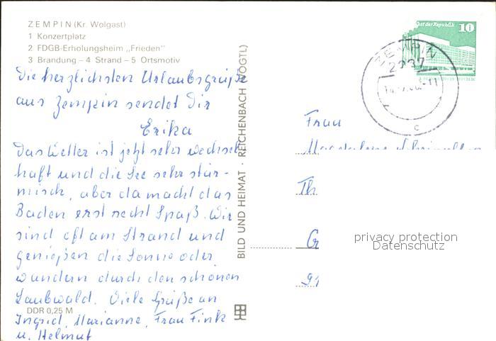 72328783 alte Postkarte Zempin Konzertplatz FDGB Erholungsheim Frieden Brandung Strand Ortsmotiv Ostseebad postalisch gelaufen Erhaltung siehe scans KatCode: 11110013059105