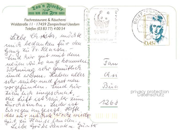 73859323 Zempin Ostseebad Tau’n Fischer und sin Fru Fischrestaurant und Raeucherei Details postalisch gelaufen Erhaltung siehe scans [WerneD78] alte Postkarte Wern Katcode 11110013059105