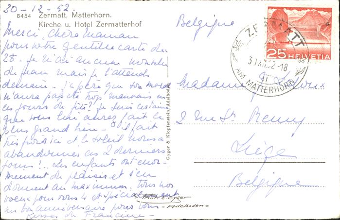 11113784 alte Postkarte Zermatt VS Matterhorn Hotel Zermatterhof postalisch gelaufen KatCode: 11470230750772