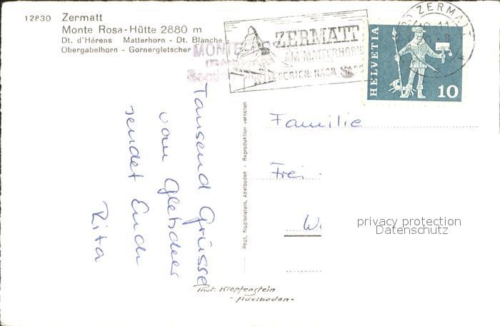 11853315 alte Postkarte Zermatt VS Monte Rosa Huette mit Matterhorn Dt Blanche Obergabelhorn Gornergrat postalisch gelaufen Erhaltung siehe scans KatCode: 11470230750772