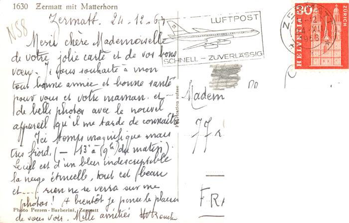 13876340 alte Postkarte Zermatt VS Ortsmotiv mit Kirche Blick zum Matterhorn postalisch gelaufen Erhaltung siehe scans [FriedD77] KatCode: 11470230750772