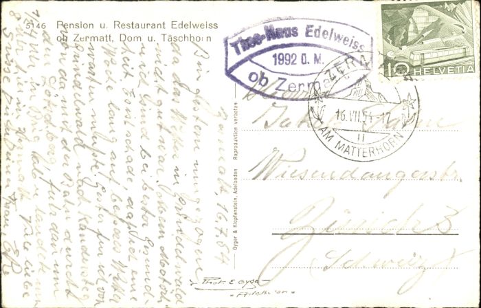 10724127 alte Postkarte Zermatt VS Zermatt Pension Restaurant Edelweiss postalisch gelaufen KatCode: 11470230750772