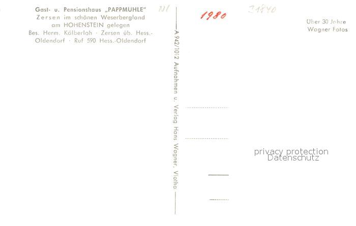 73650985 Zersen Gasthaus Pension Pappmuehle Landschaftspanorama Weserbergland postalisch nicht gelaufen Erhaltung siehe scans [FriedD77] KatCode: 11110003252007