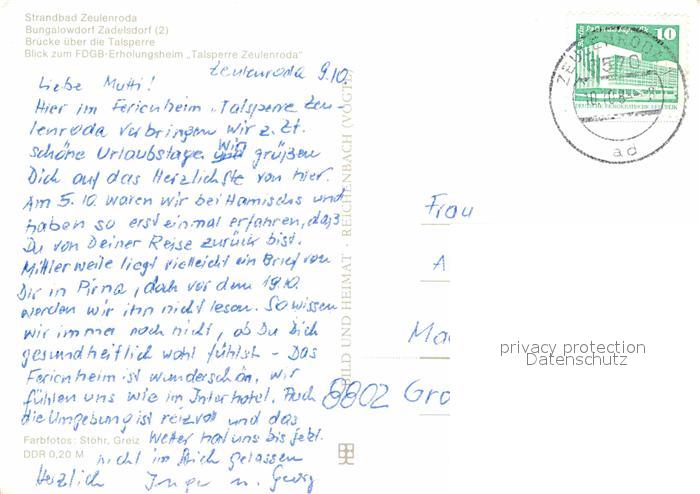 72919644 alte Postkarte Zeulenroda-Triebes Strandbad Bungalowdorf Zadelsdorf Bruecke Talsperre FDGB Erholungsheim postalisch gelaufen Erhaltung siehe scans [FriedD77] KatCode: 11110016076087