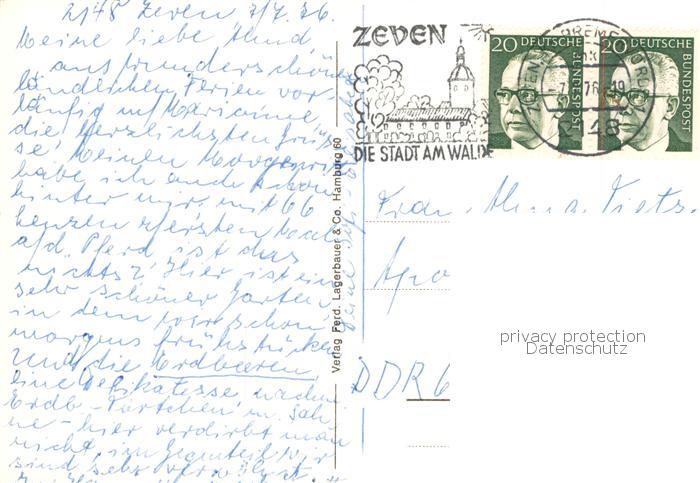 73814345 alte Postkarte Zeven Strassenpartie Schwimmbad Park Fontaene Kirche postalisch gelaufen Erhaltung siehe scans [FriedD77] KatCode: 11110003357057