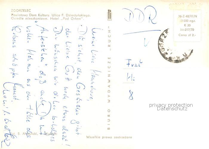 old postcard Zgorzelec Powiatowy Dom Kultury Ulica F. Dzierzynskiego Osiedle mieszkaniowe Hotel Pod Orlem postalisch gelaufen Erhaltung siehe scans [FriedD77]