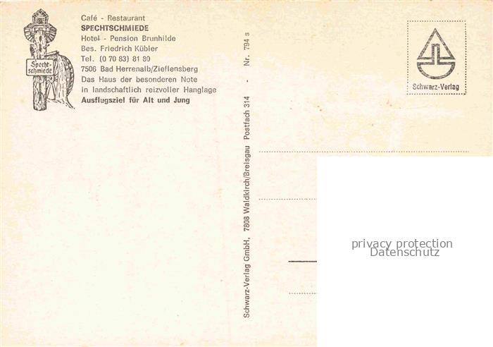 Zieflensberg Bad Herrenalb Cafe Restaurant Spechtschmiede postalisch nicht gelaufen Erhaltung siehe scans [WerneD78] Wern Katcode 11110008235033