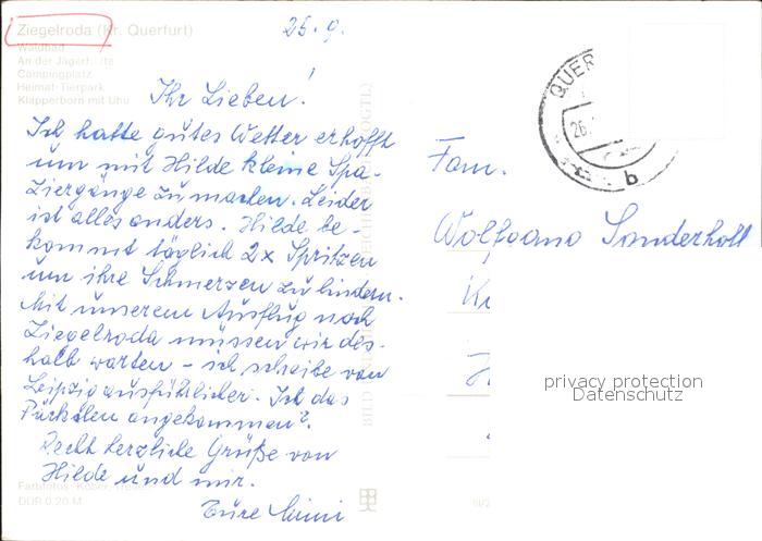 72326103 alte Postkarte Ziegelroda Waldbad Jaegerhuette Campingplatz Heimat Tierpark Klapperborn mit Uhu postalisch gelaufen Erhaltung siehe scans KatCode: 11110015088305