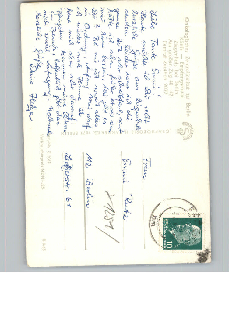 31177059 Ziegenhals Berlin Onkologische Klinik postalisch nicht gelaufen KatCode: 11110012061572