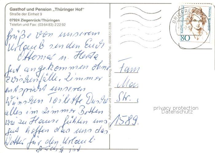 73651685 alte Postkarte Ziegenrueck Gasthof Pension Thueringer Hof Restaurant Ortsansicht mit Kirche postalisch gelaufen Erhaltung siehe scans [FriedD77] KatCode: 11110016075127