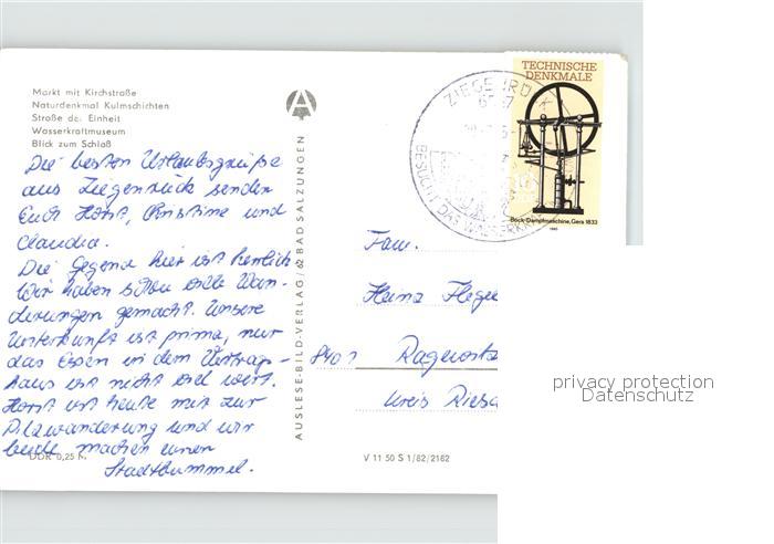 71945757 alte Postkarte Ziegenrueck Saale Markt Krichstrasse Naturdenkmal Kulmschichten Strasse Einheit Wasserkreftmuseum postalisch gelaufen KatCode: 11110016075127