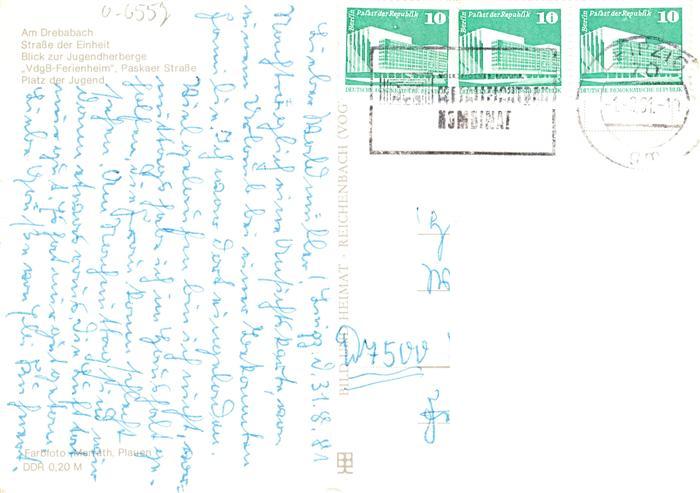 73938605 alte Postkarte Ziegenrueck Saale Thueringen Am Drebabach Strasse der Einheit Blick zur Jugendherberge VdgB Ferienheim Platz der Jugend postalisch gelaufen Erhaltung siehe scans [WerneD78] KatCode: 11110016075127