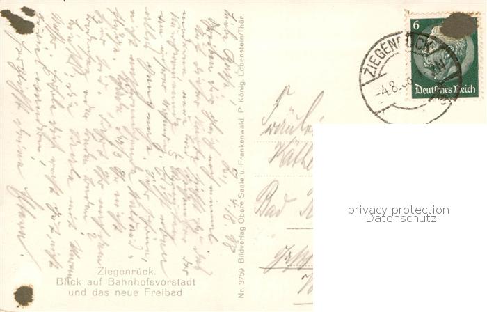 73821585 Ziegenrueck Thueringen Blick auf Bahnhofsvorstadt und das neue Freibad postalisch gelaufen Erhaltung siehe scans [WerneD78] alte Postkarte Wern Katcode