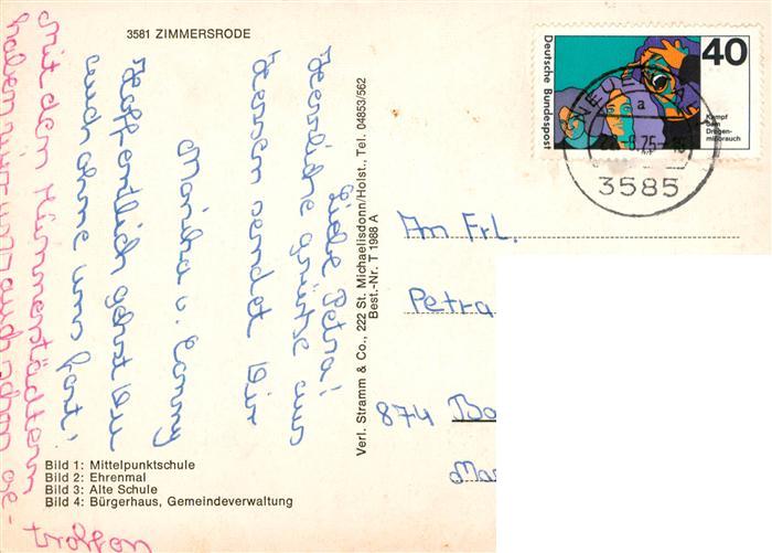 73898361 alte Postkarte Zimmersrode Mittelpunktschule Ehrenmal Alte Schule Buergerhaus Gemeindeverwaltung postalisch gelaufen Erhaltung siehe scans [WerneD78] KatCode: 11110006634016