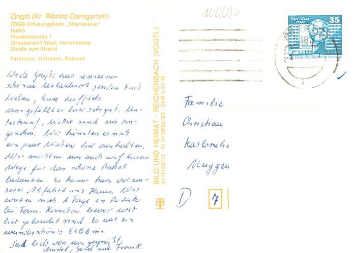 73948064 alte Postkarte Zingst Ostseebad FDGB Erholungsheim Stoertebeker Hafen Friedensstrasse Urlauberdorf West Strasse zum Strand postalisch gelaufen Erhaltung siehe scans [WerneD78] KatCode: 11110013057096