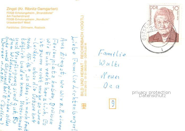 73013685 alte Postkarte Zingst Ostseebad FDGB Erholungsheim Stranddistel Am Fischerstrand FDGB Erholungsheim Nordlicht Urlauberdorf West postalisch gelaufen Erhaltung siehe scans [WerneD78] KatCode: 11110013057096