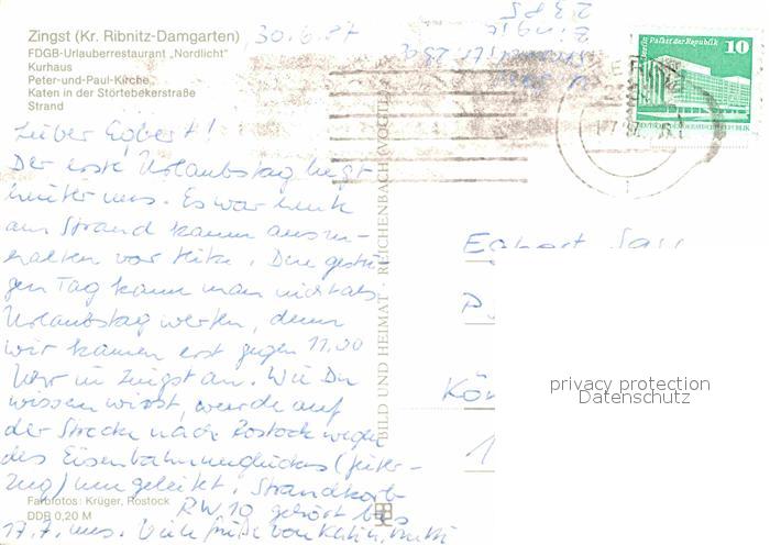 72617191 alte Postkarte Zingst Ostseebad FDGB Restaurant Nordlicht Kurhaus Peter und Paul Kirch Katen Stoertebekerstrasse Strand postalisch gelaufen Erhaltung siehe scans [WerneD78] KatCode: 11110013057096