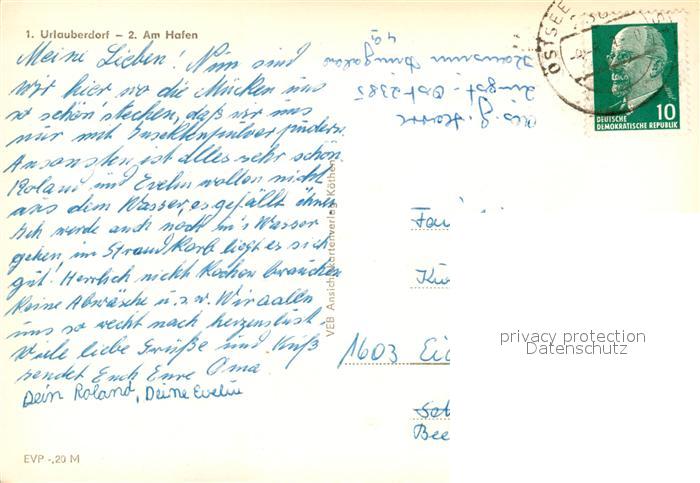 73073437 alte Postkarte Zingst Ostseebad Urlauberdorf Reetdachhaus Strand Hafen Faehre postalisch gelaufen Erhaltung siehe scans [FriedD77] KatCode: 11110013057096