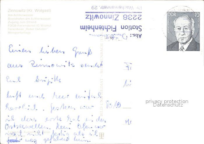 72370731 alte Postkarte Zinnowitz Ostseebad Achterwasser Bootshafen Strand FDGB Feriendienst IG Wismut Ferienheim Roter Oktober Minisportanlage postalisch gelaufen Erhaltung siehe scans KatCode: 11110013059107
